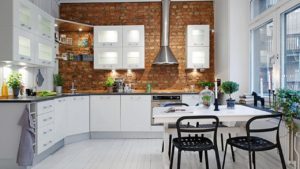 Otra idea sería, que pueda diseñarse solo alguna pared construida en ladrillo. Hay muchos diseños en los cuales puedes decidir qué hacer con ladrillos y a que pared darle un acabado liso o con texturas muy suaves, dependiendo de cómo sea tu cocina.