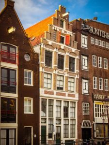 La fachada más angosta de Ámsterdam… ¡mide poco más de un metro! Encuéntrala en la foto siguiente: es el frente rojo del ancho de una sola ventana.
